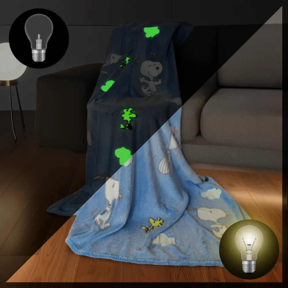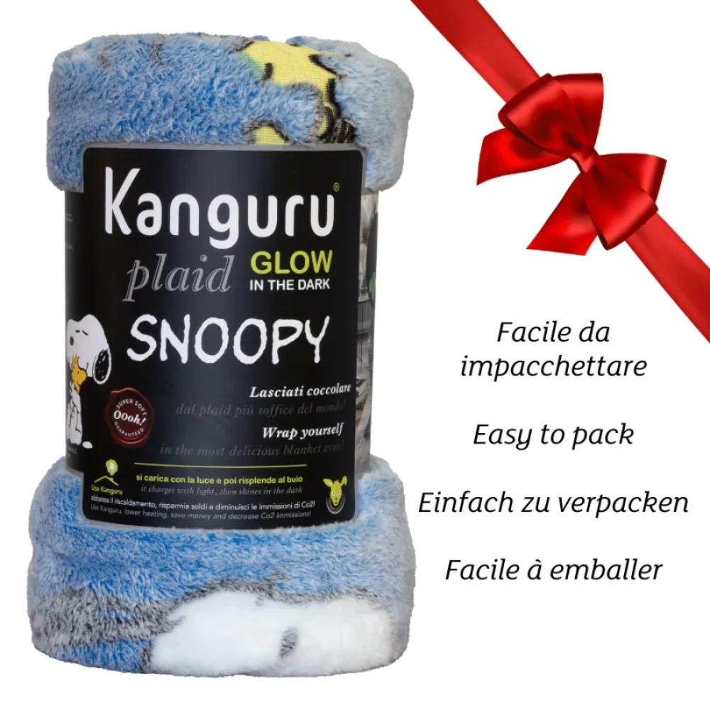 Ζεσταθείτε και απολαύστε ατελείωτες στιγμές χαλάρωσης με την κουβέρτα Kanguru “Plaid Glow Snoopy Blue”. Κατασκευασμένη από πολύ μαλακό fleece / microfibre, συνδυάζει άνεση και πρακτικότητα — τέλεια για καναπέ, κρεβάτι, ή στιγμές χαλάρωσης στο σπίτι. Το χαρακτηριστικό που την κάνει ξεχωριστή; Σχέδιο με τον αγαπημένο ήρωα Snoopy και δυνατότητα glow-in-the-dark — δηλαδή «φορτίζει» όταν υπάρχει φως και «φωτίζει» απαλά στο σκοτάδι, προσφέροντας μια παιχνιδιάρικη, μαγική ατμόσφαιρα.